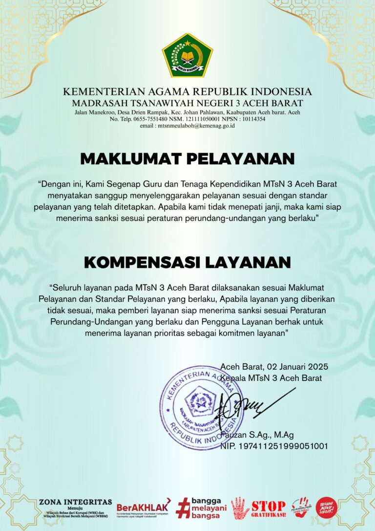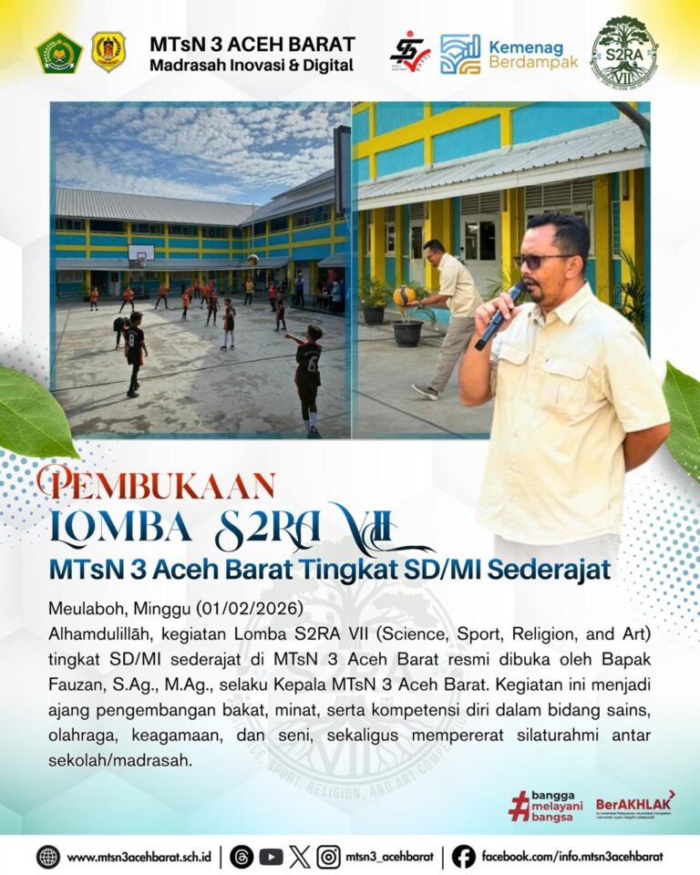 MTsN 3 Aceh Barat adalah lembaga pendidikan setingkat menengah pertama di bawah naungan Kementerian Agama yang berdedikasi mencetak generasi unggul berbasis digital dan berakhlakul karimah.