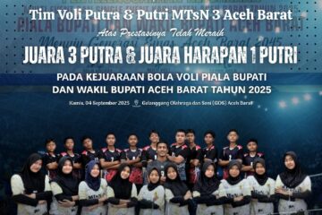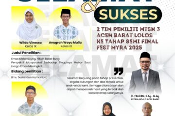 Dua tim peneliti dari MTsN 3 Aceh Barat berhasil lolos ke tahap semi final Festival Madrasah Young Researchers Aceh ( FEST MYRA) Tahun 2025. Prestasi ini menjadi bukti nyata semangat, kerja keras, dan dedikasi siswa dalam bidang penelitian dan inovasi. Bidang Penelitian Ilmu sosial dan Humaniora mengagas judul:” Emas Melambung, Read more