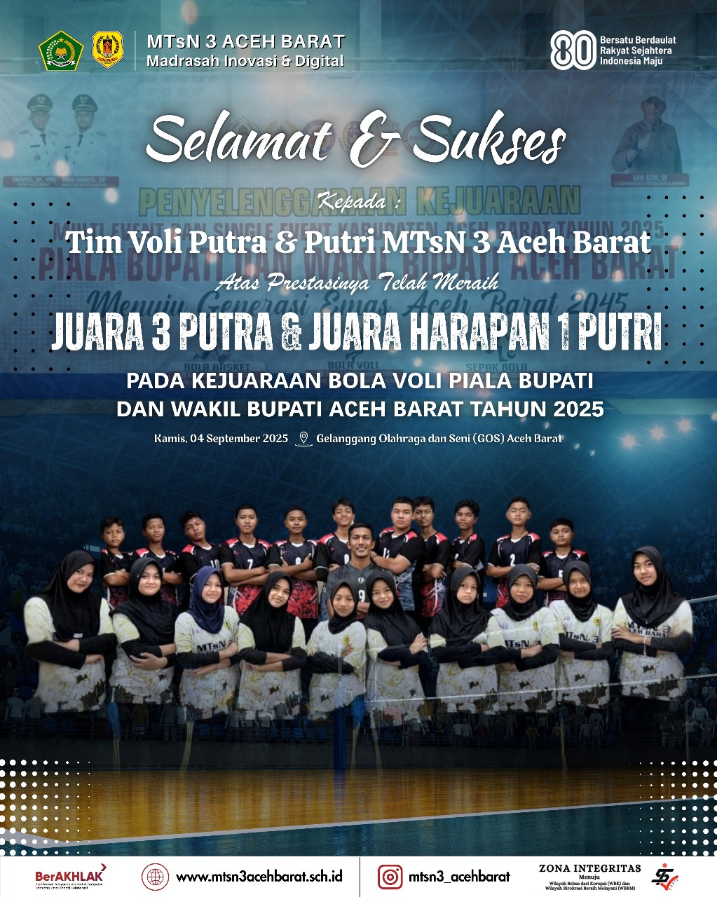 Raih Dua Gelar, MTsN 3 Aceh Barat Buktikan Eksistensi di Kejuaraan Bola Voli Piala Bupati Aceh Barat Tahun 2025