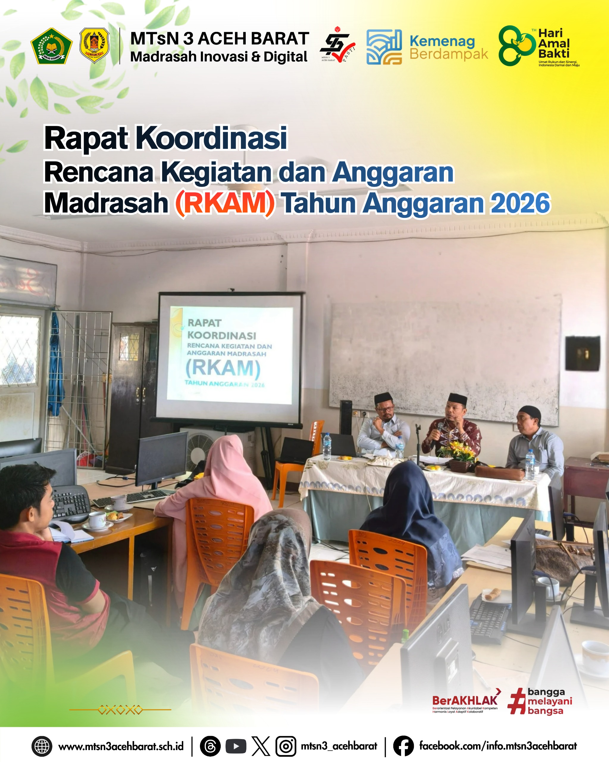 Dalam upaya mewujudkan pengelolaan madrasah yang transparan, akuntabel, dan berorientasi pada peningkatan mutu pendidikan, MTsN 3 Aceh Barat menggelar rapat koordinasi bersama Komite Madrasah untuk membahas Rencana Kerja dan Anggaran Madrasah (RKAM) Tahun 2026. Kegiatan ini menjadi forum strategis untuk menyatukan visi dan menyelaraskan program kerja madrasah dengan dukungan serta peran aktif komite.